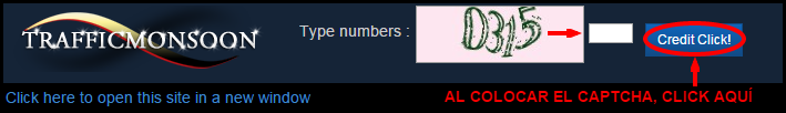 Se abrirá una ventana con publicidad (no es necesario verla, pueden entretenerse con otra página mientras tanto) igual como si estuvieran viendo anuncios del autosurf pero a diferencia el tiempo que tarda en visualizarlos depende del valor del anuncio, luego al terminar los segundos colocan un captcha y le dan en donde dice “Credit Click!”: